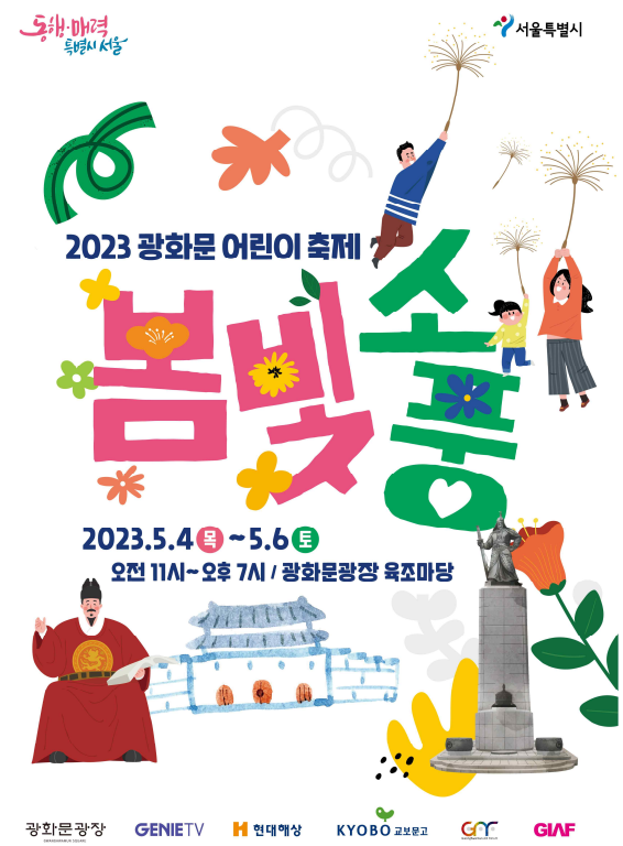 2023년 어린이날을 맞이하여, 서울시는 광화문광장에서 새롭게 개최하는 어린이날 축제인 '광화문 어린이 축제 봄빛소풍'을 소개합니다. 이 축제는 5월 4일부터 5월 6일까지 3일간 진행되며, 오전 11시부터 오후 7시까지 운영됩니다. 광화문광장 육조마당에서는 체험과 이벤트 부스, 캐릭터 포토존, 무대 등이 운영됩니다. 개막공연은 놀이마당의 특설무대에서 진행됩니다. 이번 어린이날 축제의 주제는 '소풍'으로, 아이들이 설렘과 기대를 안고 광화문광장으로 나들이 오는 모습을 상상하고 있습니다.
