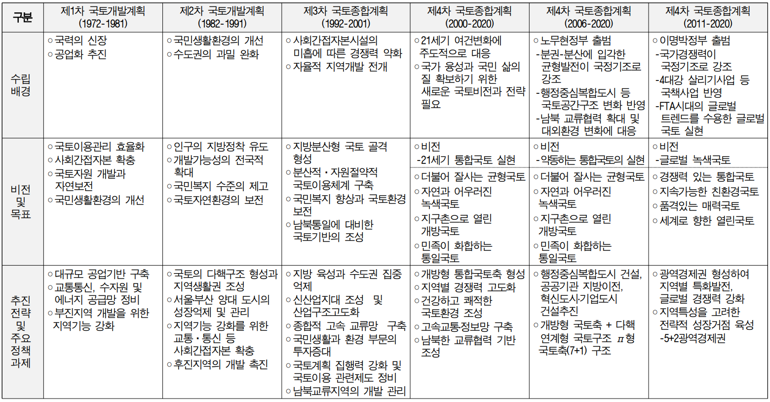 ㅇ 제4차 국토종합계획(2000~2020) : 지역 간의 통합, 동북아 지역과의 통합을 목표로 균형개발, 개발과 환경의 조화를 통한 개방형 통합국토 추진