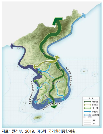 - 생태녹지축은 백두대간 보호지역 및 DMZ(군사보호지역+민간통제지역), 능선축, 산줄기 연결망, 광역생태축 등을 고려하여 보전 및 복원