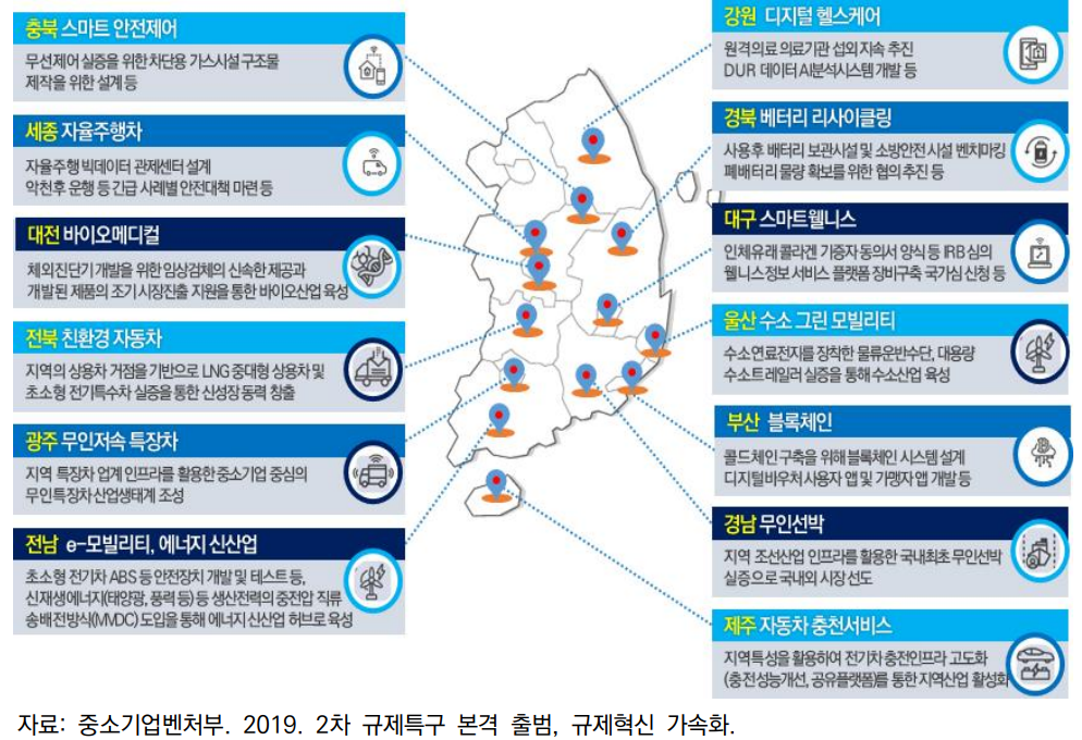 - 규제에서 자유로운 지역을 선정하여 혁신 기술 테스트는 물론 관련 기업을 집중 육성하는 규제자유특구 활성화 추진