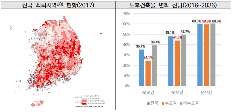 ㅇ 도시의 물리적․경제적․사회적 쇠퇴가 심화되고 있으며, 대도시는 노후 건축물 확산 등 물리적 환경의 노후화가, 지방중소도시는 인구감소 우려가 부각
