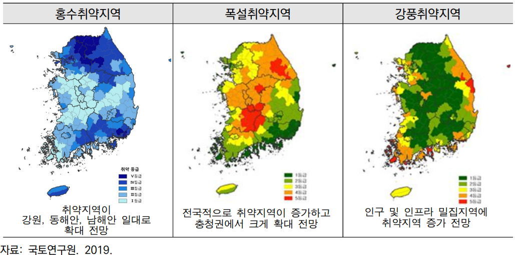 ㅇ 기후 변화 영향으로 홍수, 가뭄, 폭설, 폭염, 지진 등의 자연재해 발생빈도가 높아지고 발생시기․패턴이 다양해지며, 피해규모도 대형화될 전망