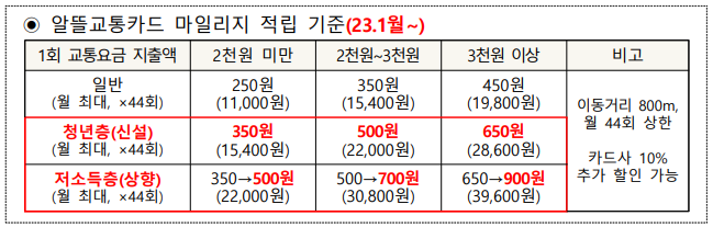 국토교통부(장관 원희룡) 대도시권광역교통위원회(위원장 이성해)는 이러한 알뜰교통카드의 교통비 절감 효과를 더욱 강화하고자 저소득층 대상 적립 금액을 한층 더 상향(3월~)하고, 적립 한도를 늘린 알뜰교통카드 플러스(7월~)를 선보여 대중교통을 자주 이용하더라도 경제적 부담은 적을 수 있도록 지원 혜택을 지속적 으로 늘려나간다는 계획을 발표하였다.