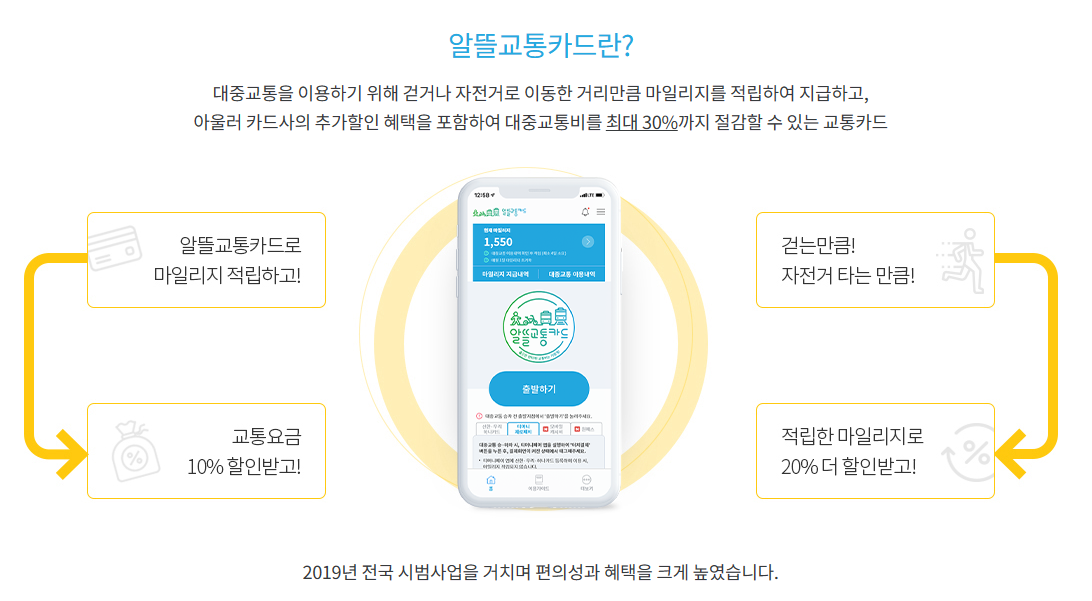 대중교통 이용 시 이동해야 하는 거리(보행·자전거 등)만큼 마일리지를 지급(공공재원)하고, 민간 카드사가 추가 할인(약 10%)해주는 제도이다.
