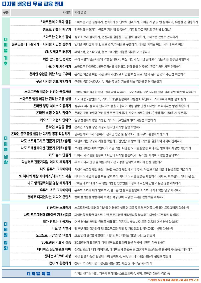 2020년부터 시작하여 올해로 4년차를 맞이하였으며, 3년간 20만 명 이상이 교육을 수강하였으며, 올해는 주민센터, 복지관, 생활유휴시설 등 지역 커뮤니티 기빈의 디지털 배움터 135개소를 통해 디지털 기초부터 생활, 심화, 특별과정까지 수준별 교육과정이 무료로 진행된다고 한다.
