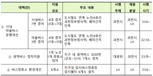 이에, 인근 도시철도역인 4호선 정부과천청사역을 운행하는 시내버스 7번과 마을버스 3번을 각 4대씩 증차하여 도시철도와의 접근성을 개선 하고, 군포시 ~ 신사역 간을 운행하는 광역버스 3030번을 지식정보타운지구 내 정류장에 추가로 정차하게 하여 지구 주민의 강남 방면 접근성도 높일 예정이다.