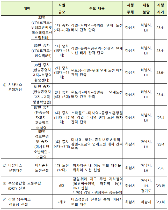 하남 감일, 미사, 위례 지구는 서울 동부권역과 지리적으로 인접하여 생활권을 공유하고 있으나, 서울 진입 등에 있어 도로 정체 및 높은 버스 혼잡도 등으로 다수 주민이 교통 불편을 호소하는 지역이다. 이에, 지구 주민 및 지자체, 사업시행자와 충분한 논의를 통해 인근 교통 거점과의 연계를 강화하기 위한 단기 보완대책을 마련하였다.