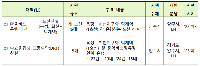 먼저, '23년 하반기에 옥정지구에서 회천지구 내 위치한 덕계역(1호선) 으로 운행하는 마을버스 노선을 신설하여 입주민의 철도 이용 편의를 제고할 계획이다.