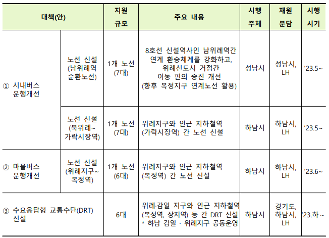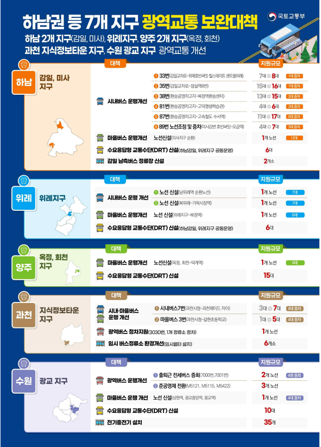 - 하남권(감일, 미사), 위례, 양주권(옥정, 회천) 시내‧마을버스 신설 및 증차, DRT 운영 등