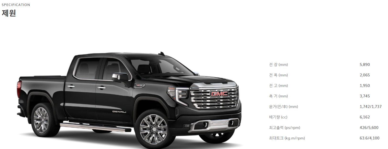 국내 출시되는 시에라는 최고급 사양인 드날리 트림의 5인승 크루캡 숏박스이며 제원에서 알 수 있듯이 정말 엄청난 크기를 자랑한다.​