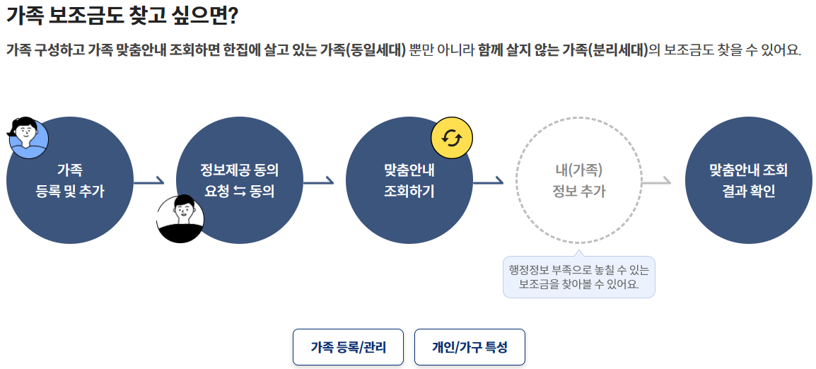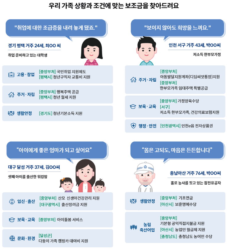 국가보조금은 모든 국민이 누려야 할 권리입니다. 보조금 24는 신청할 곳을 몰라 받지 못한 분들을 돕기 위해 만들어졌습니다. 이 서비스를 이용하여 귀하와 귀하의 가족에게 필요한 혜택을 받아보세요.