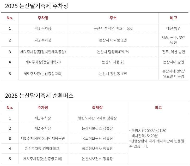 🚍 셔틀버스 운영 논산역 및 논산시외버스터미널에서 축제장까지 무료 셔틀버스를 운행할 예정입니다. 정확한 시간표는 추후 공식 홈페이지에서 확인하세요!
