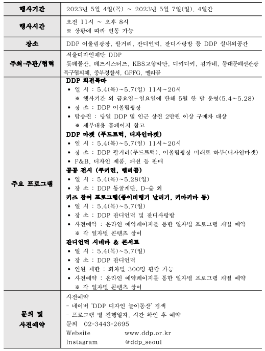 사전 예약은 네이버 예약을 통해 가능하며 프로그램별 참가비는 무료이나, 인원 제한이 있으므로 조기 마감될 수 있다. DDP 누리집에서 행사 프로그램별 상세 내용을 확인할 수 있다.